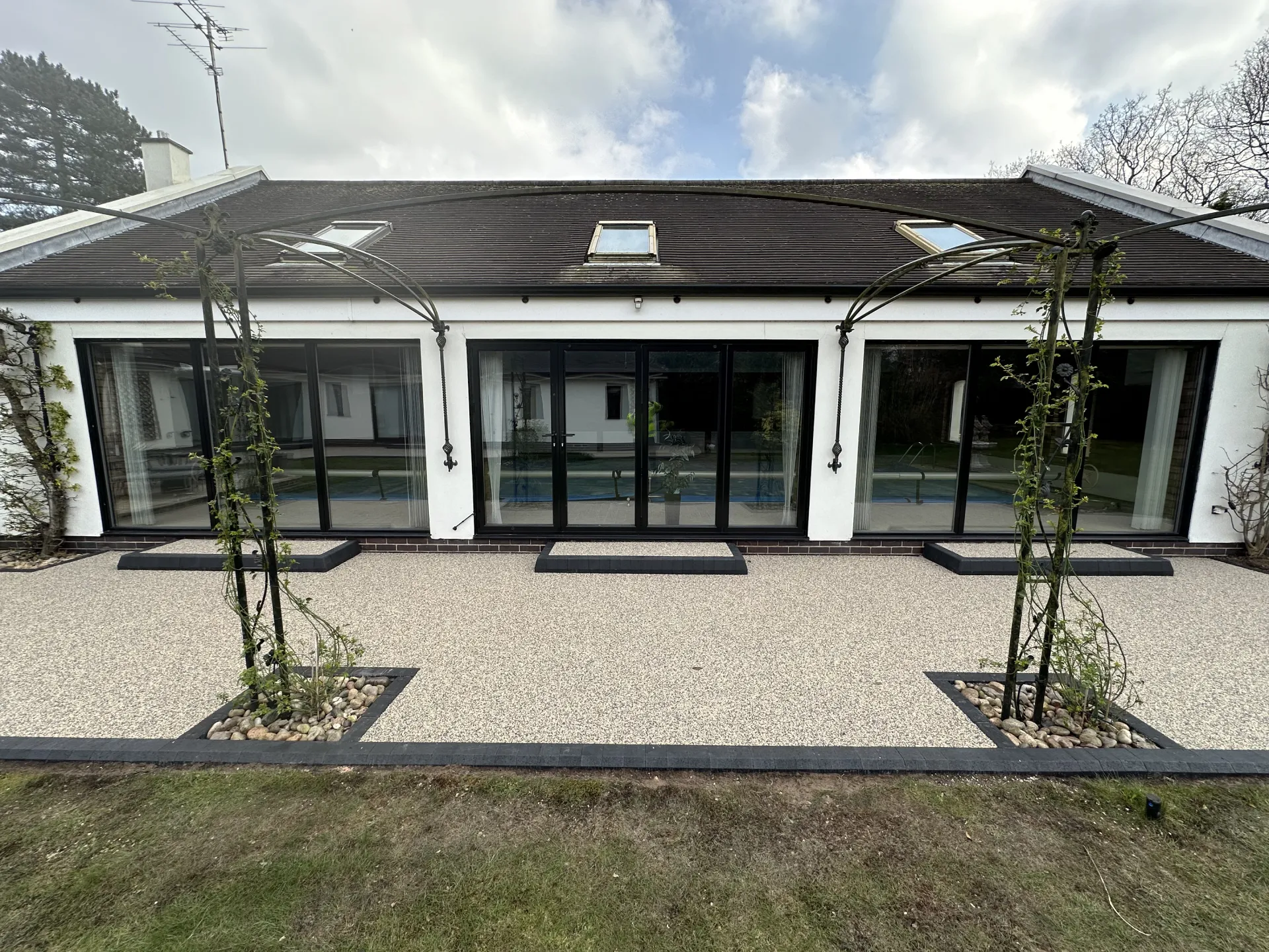 Check out this stunning example of how a resin patio can uplift the look of a property. This existing patio had stood the test of time but the client was looking for something bright seamless and low maintenance with the wonderful shape surrounding the rear of the property running along the pool house a seamless resin bound surface was the go to option. The first impressions team certainly delivered with this beautiful resin bound patio.