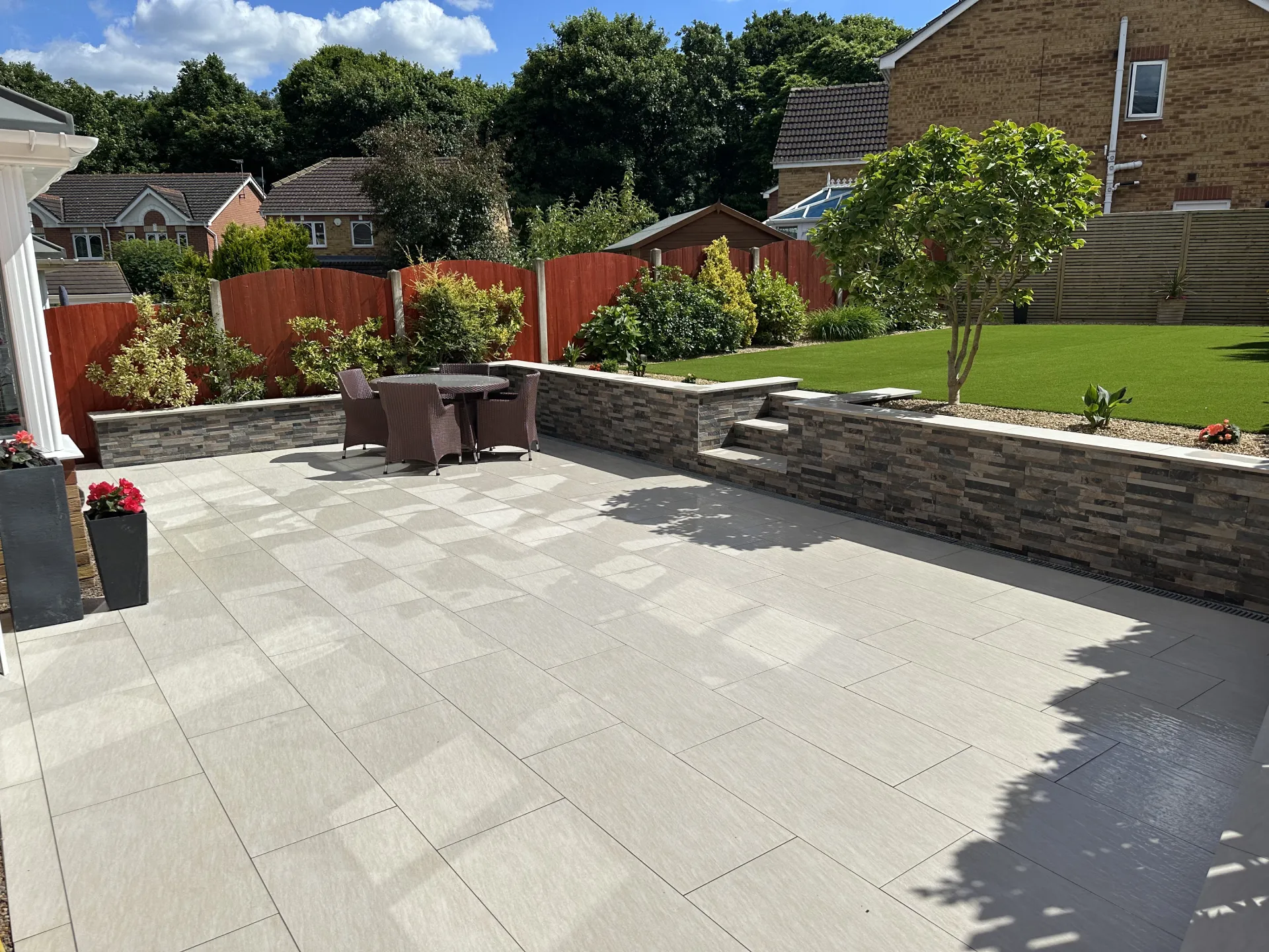 Check out this stunning garden transformation the first impressions team carried out. The client went for a beautiful Bianco cream porcelain tile patio with a contrasting London daze porcelain wall cladding with matching steps and wall copings. Such a great combination sleek and modern with a rustic touch from the wall cladding.