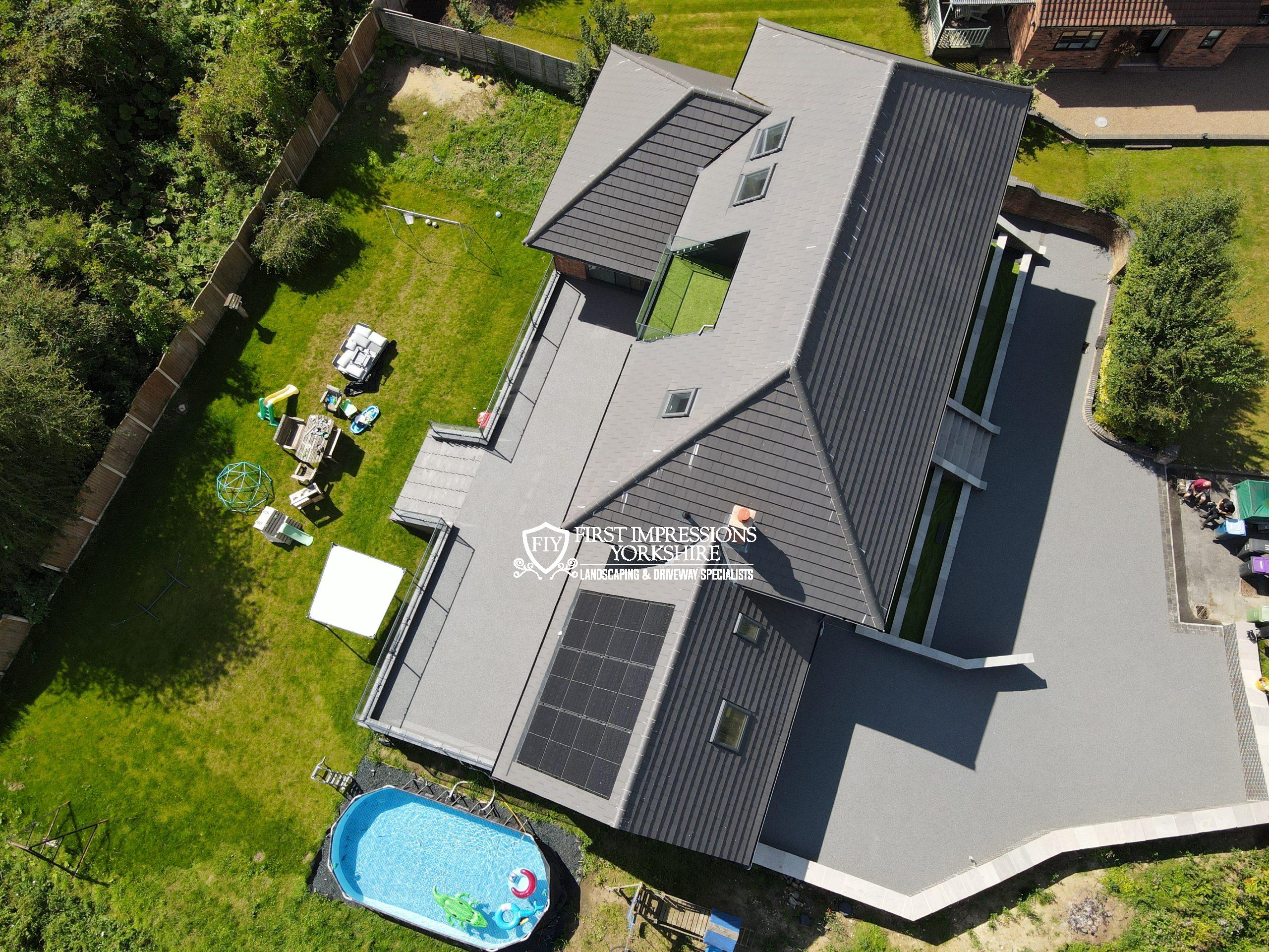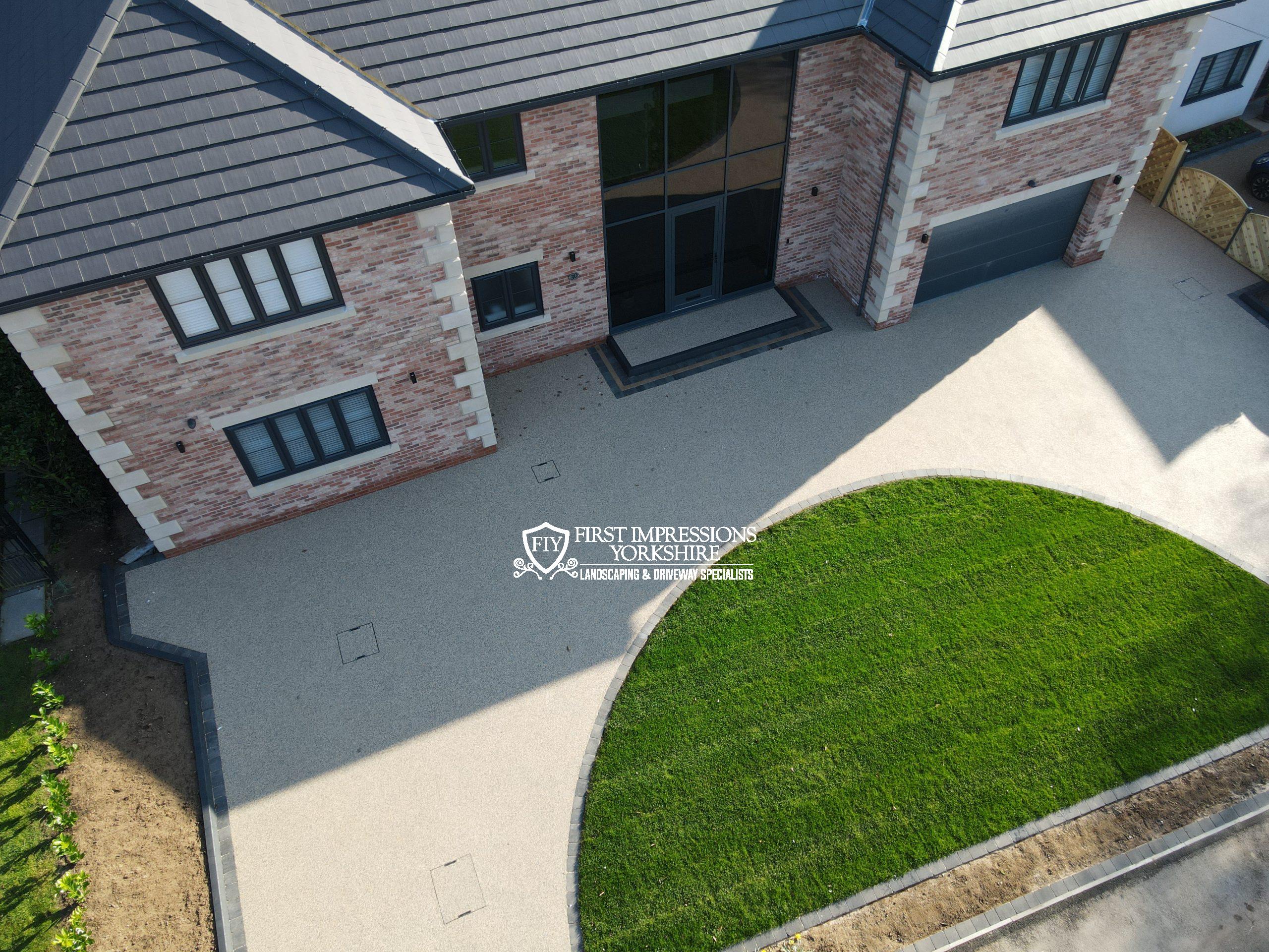 Our client was looking for a low-maintenance, permeable resin-bound driveway but with this being quite an odd shape we decided to add some character with a large block paved entrance and zoned parking area using Tobermory bracken tegula blocks we also added some feature pathways using Tobermory retro block slips also in bracken.