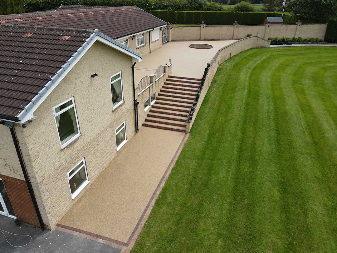 To create new patio area to the main house and pool house and Resin bound surfacing was the go to choice for the beautiful project. To start of A full excavation was carried out throughout the area before a new permeable suds compliant type 3 mot and open textured tarmac base was installed with a lovely brindle border at the entrance a new planting beds and multiple steps to the top patio area.